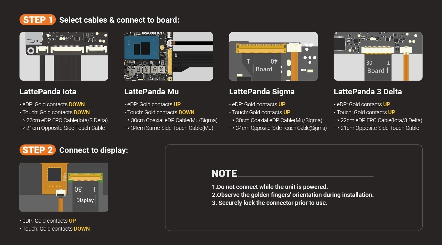 Unlike other HDMI displays, this one features an eDP interface and is the most compatible with LattePanda IOTA, LattePanda Mu, LattePanda Sigma, LattePanda 3 Delta, LattePanda 2 Alpha, and LattePanda 2 Delta.