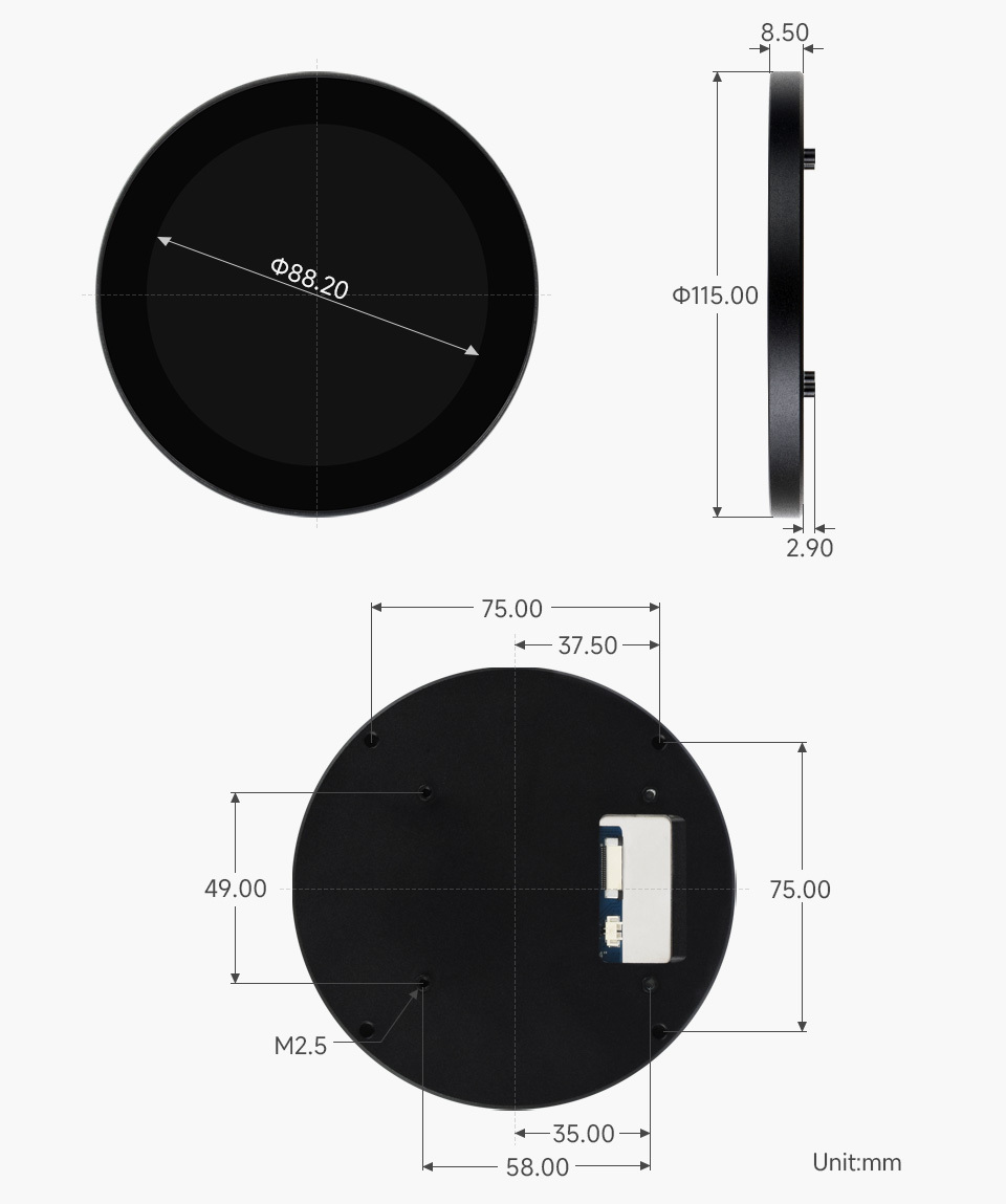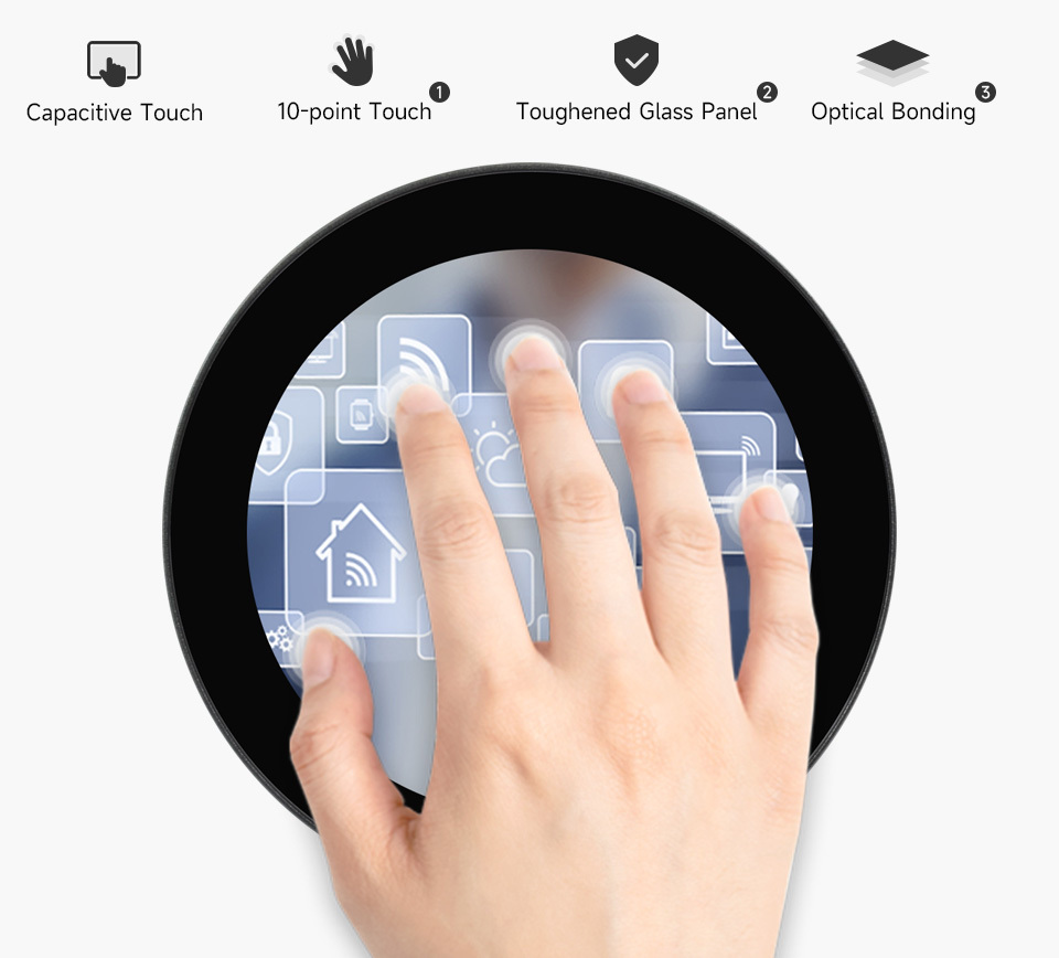 This 3.4 inch round display with 800x800 resolution is designed for modern embedded systems requiring a compact yet high-clarity visual interface. Using a DSI (Display Serial Interface), it delivers fast data transmission, reduced pin count, and stable performance, making it suitable for advanced microcontroller and processor-based designs. The round form factor enables innovative UI layouts for smart devices, industrial control panels, wearables, automotive dashboards, and IoT applications. Integrated 10-point capacitive touch support ensures smooth, accurate multi-touch interaction, enhancing user experience in both consumer and industrial environments.