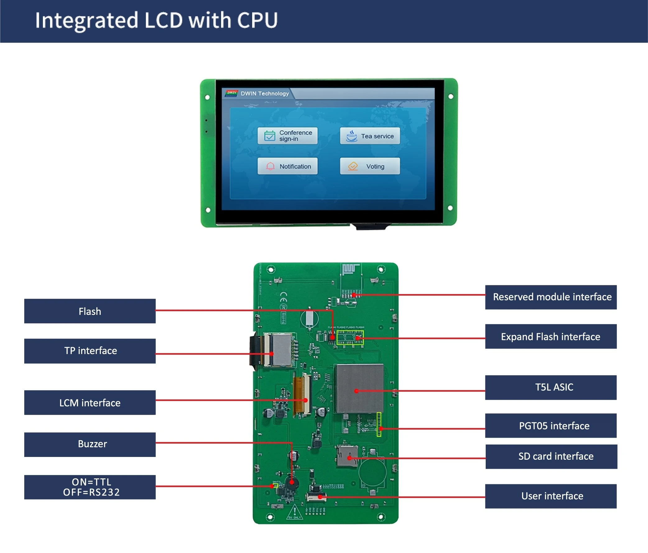 Designed for ease of development and integration, the module supports TTL and RS232 communication interfaces and allows program download via SD card or serial port. The DGUS V7.6 GUI development environment enables rapid UI creation without coding, while the dual-core architecture separates GUI handling and OS-level processing for enhanced flexibility. Developers can further customise functionality using the open DWIN OS kernel with DWIN OS language or KEIL C51, making this display suitable for advanced embedded system design and industrial-grade HMI solutions.