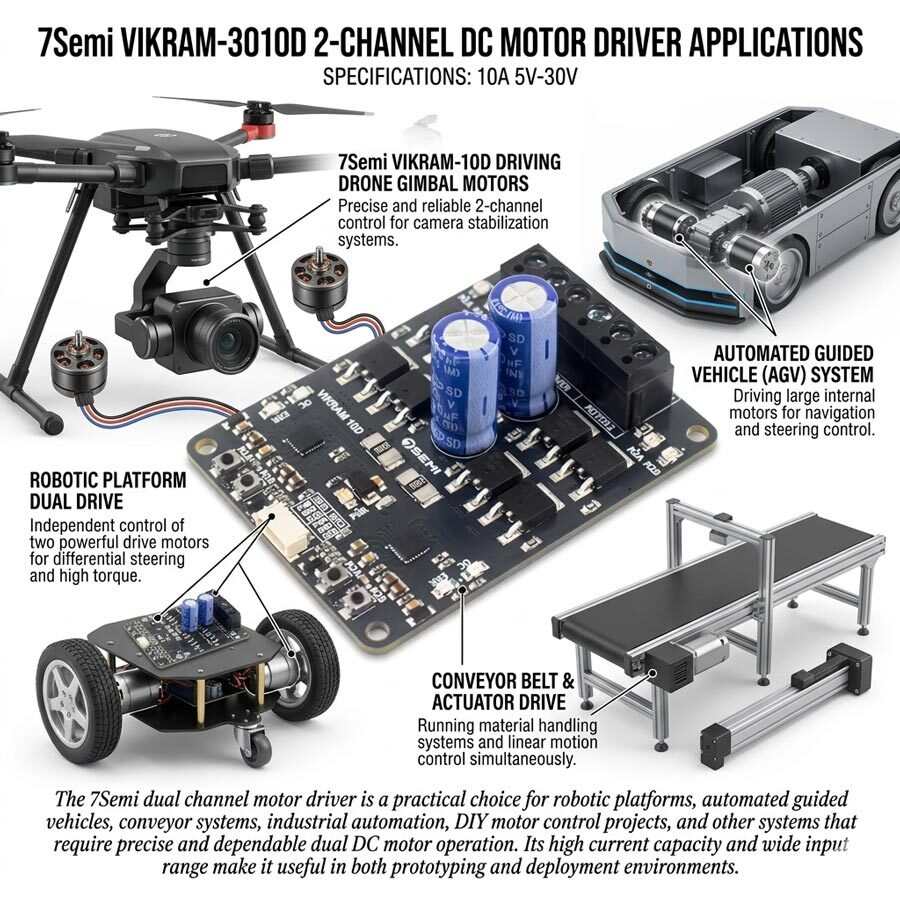The 7Semi dual-channel motor driver is a practical choice for robotic platforms, automated guided vehicles, conveyor systems, industrial automation, DIY motor control projects, and other systems that require precise and dependable dual DC motor operation. Its high current capacity and wide input range make it useful in both prototyping and deployment environments.