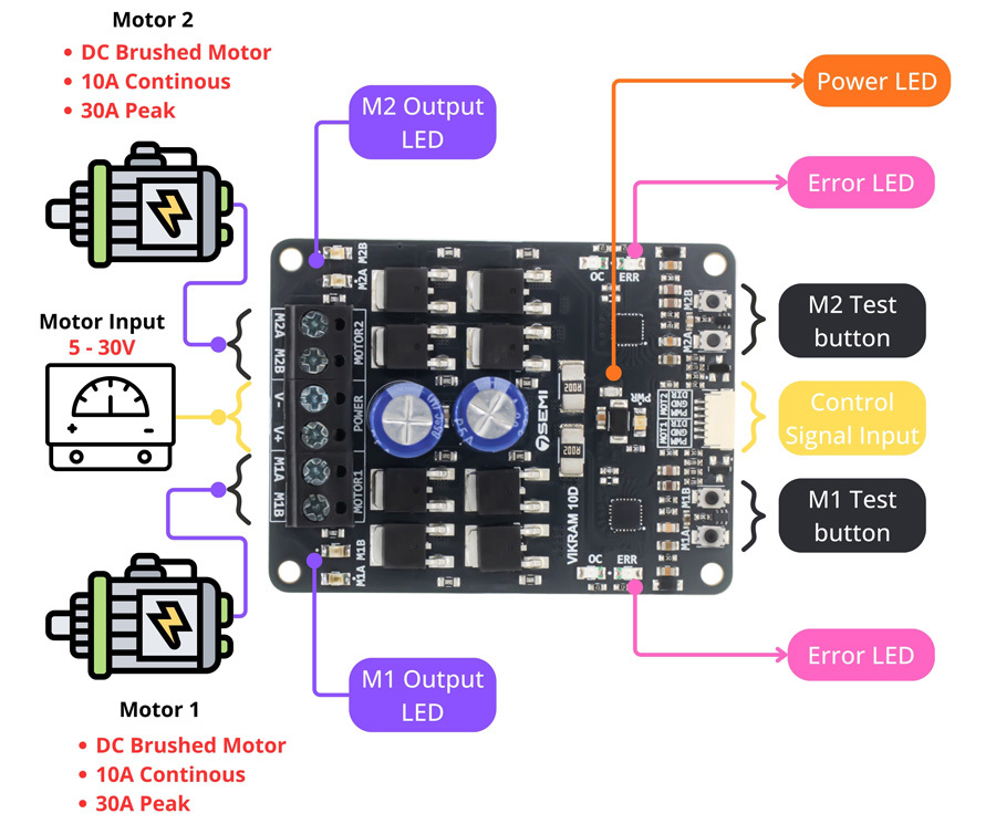 The 7Semi VIKRAM 3010D dual-channel DC motor driver is designed for applications that need reliable high-current motor control with flexible voltage support. It operates from 5V to 30V DC input and delivers up to 10A continuous current per channel, making it suitable for demanding robotics, AGVs, automation systems, and motor-driven machinery.
