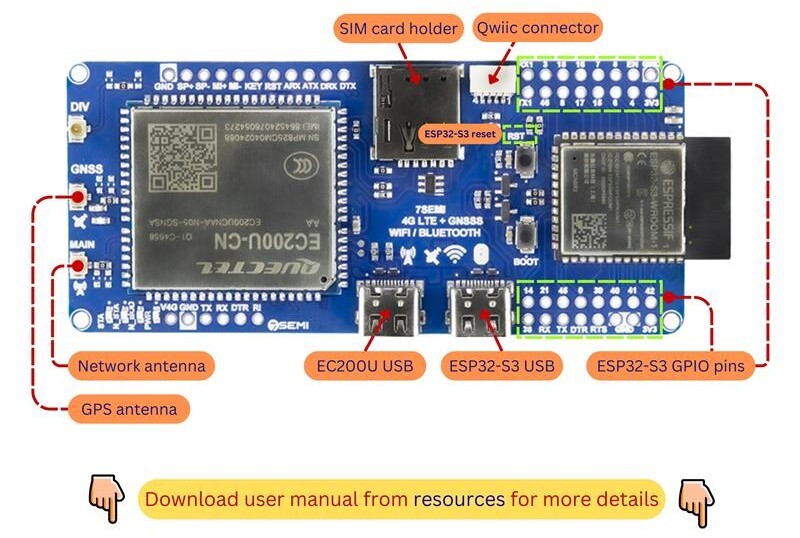 The 7Semi ESP32-S3 EC200U 4G LTE Cat-1 WiFi Bluetooth GNSS IoT Smart Modem is designed to offer seamless wireless communication, supporting LTE-FDD, LTE-TDD, GSM/GPRS networks, and GNSS for enhanced navigation solutions. Ideal for outdoor monitoring, portable 4G WiFi hotspots, and smart home applications, this modem integrates an ESP32-S3-WROOM-2 module for AI and IoT applications. Its dual-core processor ensures efficient data handling and low-power consumption, making it suitable for a wide range of industrial and personal IoT setups.