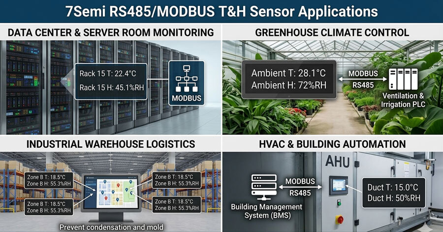 The 7Semi Industrial RS485 Temperature and Humidity Sensor Probe is designed for accurate and stable measurement in demanding industrial and commercial environments. With Modbus RTU communication over RS485, it supports reliable long distance data transfer and easy integration with PLC, SCADA, HMI, and microcontroller based systems. Its stainless steel probe and breathable dust-proof filter make it suitable for continuous use in HVAC, building automation, and industrial monitoring applications.