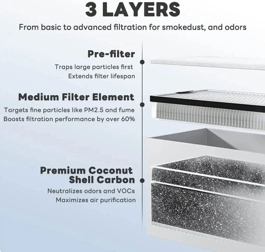 - Three Stage Filtration Includes pre-filter H13 HEPA filter and activated carbon filter for effective pollutant removal
