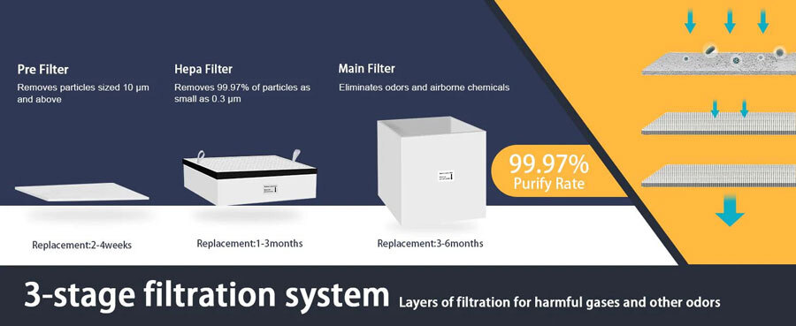 Uses pre filter, HEPA filter, and activated carbon filtration for effective smoke and particle removal.