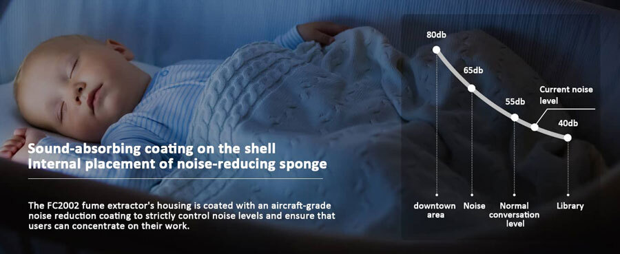 The FC-2002 smoke extractor is designed for desktop environments where effective fume and particle removal is essential for safe and consistent operation. With suction performance up to 260 m3/h or 153 CFM, it efficiently captures smoke, dust, powders, wood particles, and other fine contaminants within close range of the extraction hood. This makes it suitable for soldering benches, electronics repair stations, small laser engraving and cutting machines, 3D printing setups, and nail salon workspaces where airborne pollutants can affect both health and equipment cleanliness.
