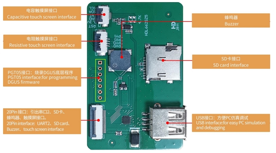 Operating on 3.3V to 5.5V DC with a typical 5V supply, the HDL662SZ5 offers low power consumption (<5W), and easy connectivity through its 20-pin 0.5mm FFC interface. It supports DGUS project downloads via SD card (4Mb/s) and provides UART2 (TTL level) communication for display data exchange, debugging, or integration with microcontrollers and embedded CPUs.