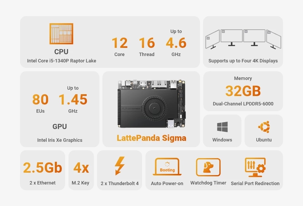 LattePanda Sigma single board server offers a wide range of operating systems, including Windows 10, Windows 11, and Ubuntu, guaranteeing that there is always one that meets your requirements.