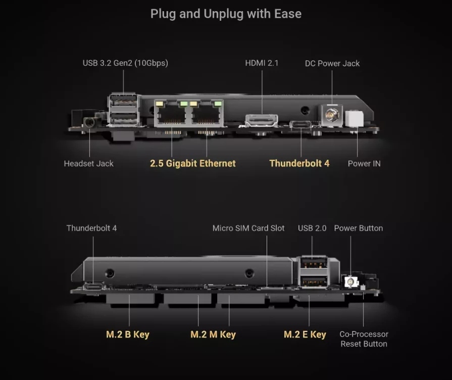 LattePanda Sigma supports a wide range of interfaces, including USB, HDMI, RS232, GPIO, Ethernet, and eDP. It also has four M.2 slots and two Thunderbolt 4 ports, allowing for fast connections and wide extension options for M.2 SSDs, 4G/5G modules, Wi-Fi modules, HD displays, eGPU, Type-C docks, and more.