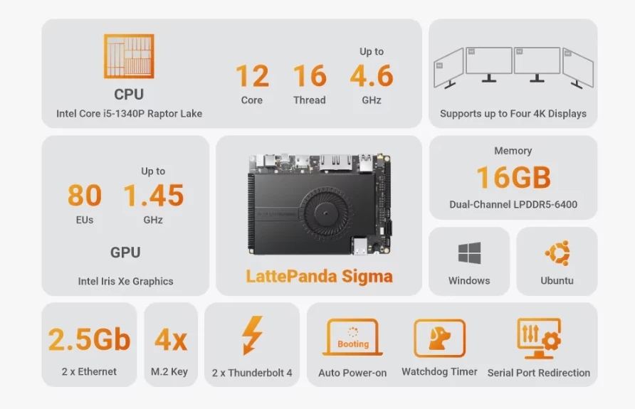 Equipped with 16GB dual-channel LPDDR5-6400 RAM, the Sigma ensures ultra-fast data throughput and smooth multitasking for demanding applications. Its integrated Intel Iris Xe Graphics supports quad 4K display outputs, enabling immersive visualization, content creation, and professional-grade multimedia workflows. With a user-friendly plug-and-play design, versatile interface layout, and support for Windows 10, Windows 11, and Ubuntu, the LattePanda Sigma is designed to be a powerful, hackable SBC that caters to developers, system integrators, and enthusiasts alike.