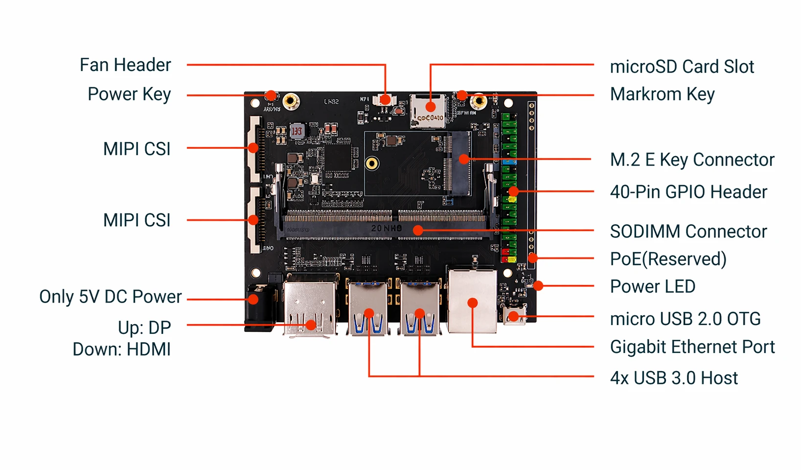 Equipped with 4x USB3.0 ports and a Micro USB2.0 OTG port, the NX5 IO Board ensures fast data transfer and peripheral connectivity. The onboard Gigabit Ethernet with PoE support simplifies network-based deployments by enabling both data and power over a single cable.