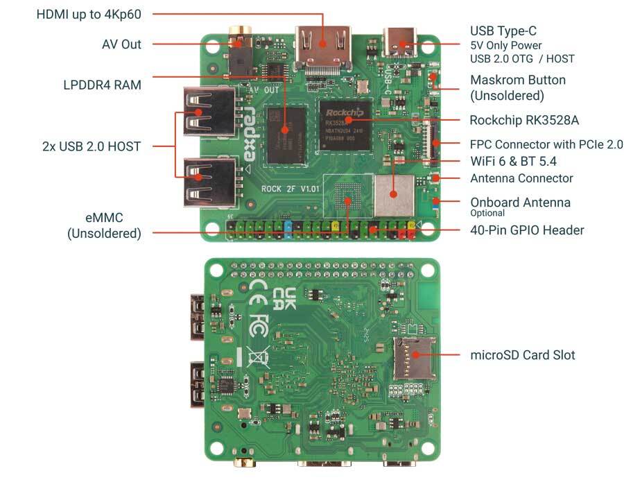 The Radxa ROCK 2F single-board computer powered by Rockchip RK3528A is built for embedded systems, IoT development, and multimedia processing applications. With a quad-core ARM Cortex-A53 processor and Mali-450 GPU, it delivers reliable performance for edge computing, digital signage, and smart automation projects. The board supports advanced video decoding up to 4K resolution, ensuring smooth playback for high definition media applications.