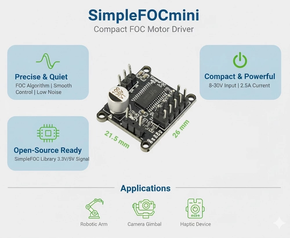 SimpleFOCmini brushless DC motor driver board is a compact high performance solution designed for accurate control of BLDC motors in space constrained embedded systems. With a small footprint of twenty six by twenty one point five millimetre it integrates advanced Field Oriented Control technology enabling real time closed loop control of motor position speed and torque with high efficiency and smooth response.