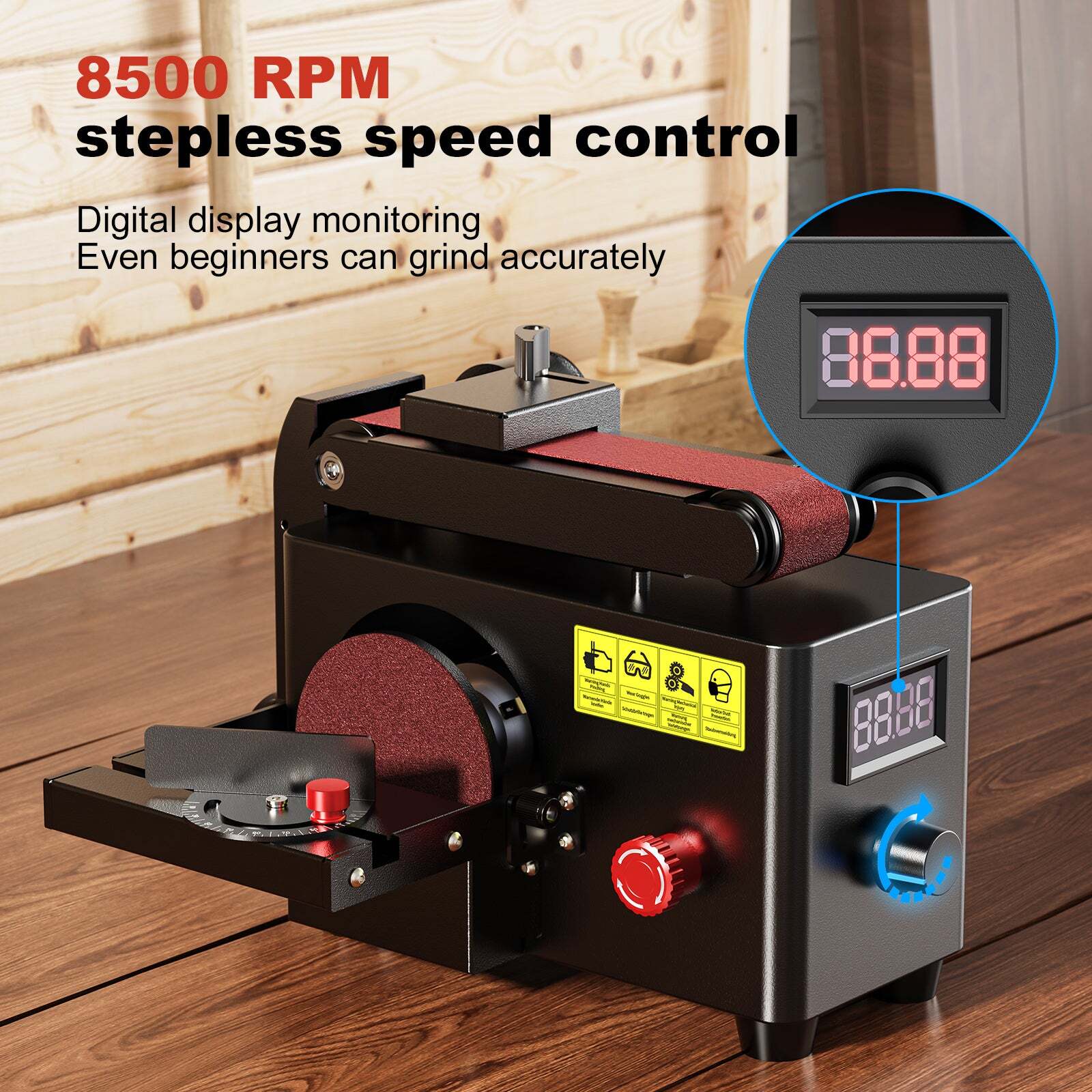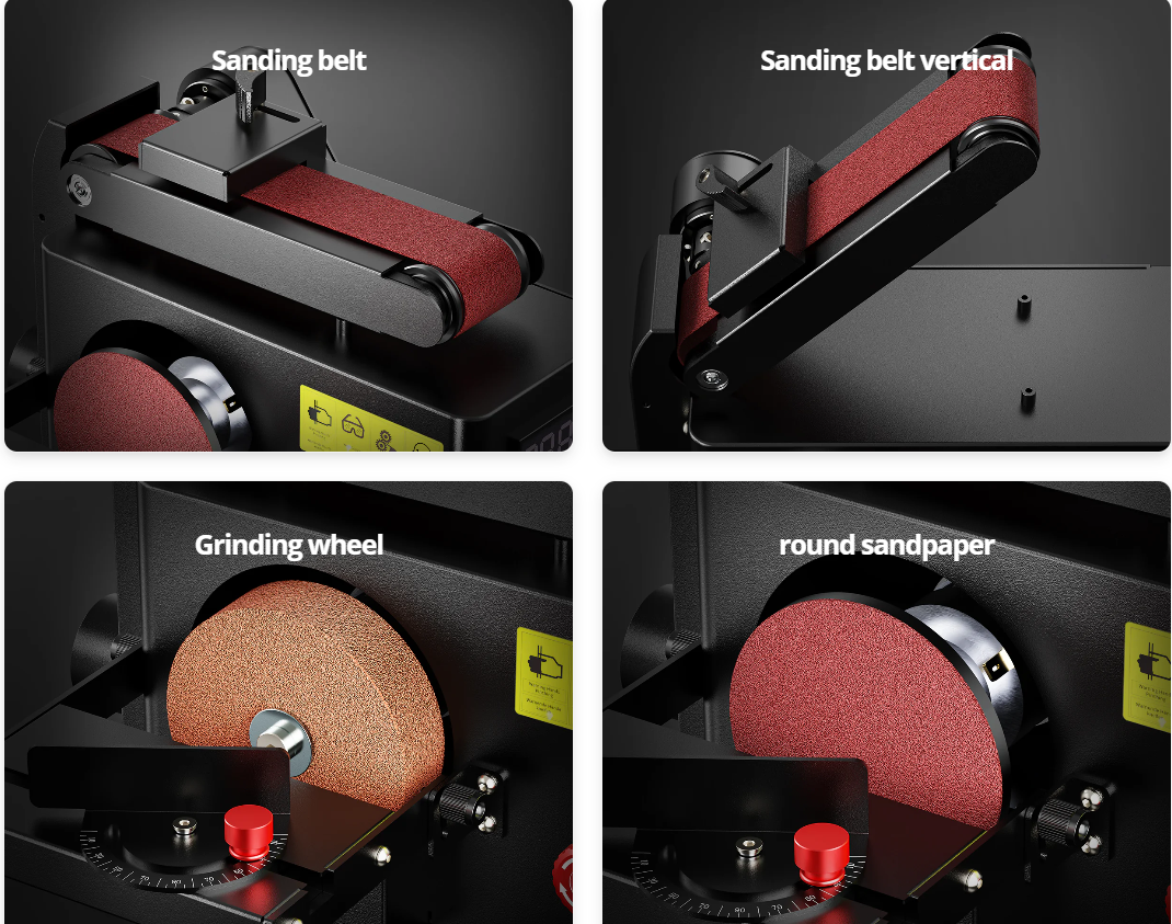 Its four in one working design makes it suitable for users who need sanding belt operation, vertical belt sanding, grinding wheel work, and round sandpaper finishing in one machine. The metal body supports durability, while the 32 mm vacuum inlet helps keep the work area cleaner during extended use. Digital speed monitoring also improves repeatability for beginners and experienced users alike.