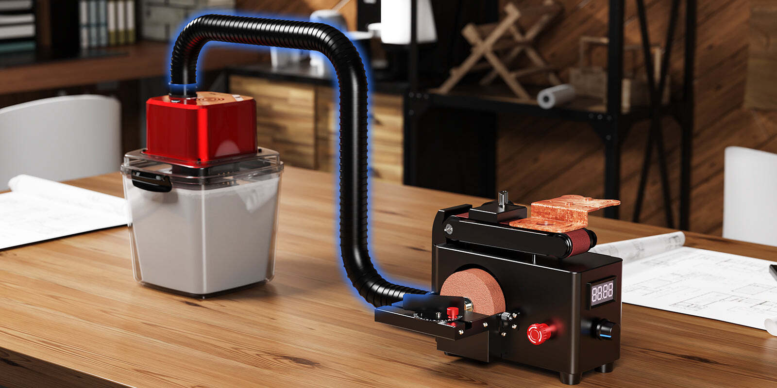 Connect the vacuum cleaner to keep the workspace clean and dust-free.