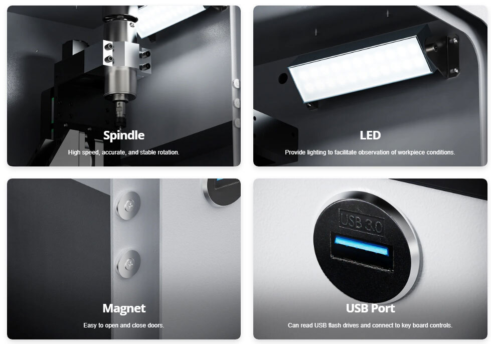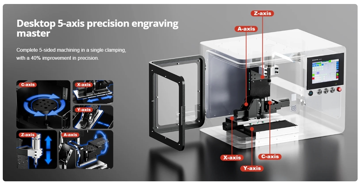 The Twotrees X5 5-Axis CNC Router Machine is a professional-grade desktop machining solution engineered to deliver unmatched precision, flexibility and reliability for complex multi-angle manufacturing tasks. Designed for advanced creators, engineers and small-scale production environments, the X5 supports complete 5-sided machining in a single clamping setup - reducing repositioning errors and improving machining precision by up to 40%. With an enclosed SPCC steel shell for enhanced rigidity and safety, the machine ensures stable operation while effectively reducing dust, noise and external interference. A new-generation system display and ergonomic handwheel provide intuitive control, allowing seamless setup, real-time adjustments and smoother workflow management. The Y-axis is equipped with a high-quality bellows cover to prevent dust ingress and extend machine life. Compact yet powerful, the Twotrees X5 is ideal for precision prototyping, jewellery making, woodworking, acrylic work, mould creation and multi-axis part manufacturing.